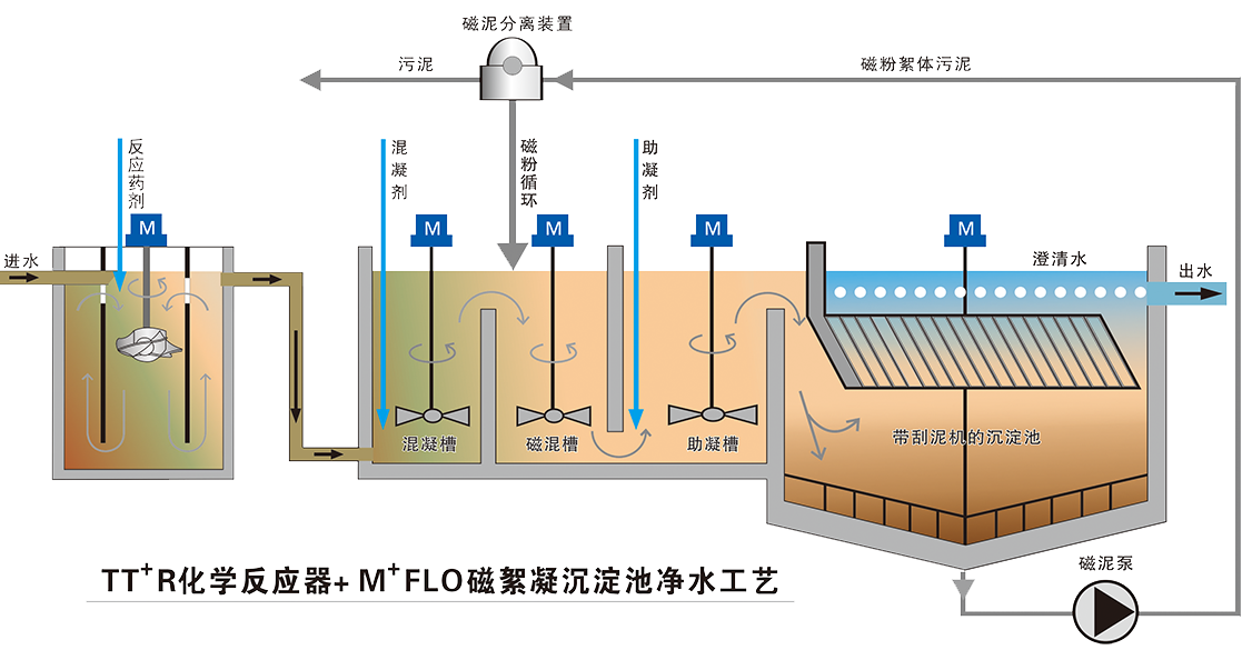 ·M+FLO磁絮凝沉淀池凈水系統 ·TT+R高效反應器+M+FLO磁絮凝沉淀池凈水系統 ·ECR電化學反應器+M+FLO磁絮凝沉淀池凈水系統